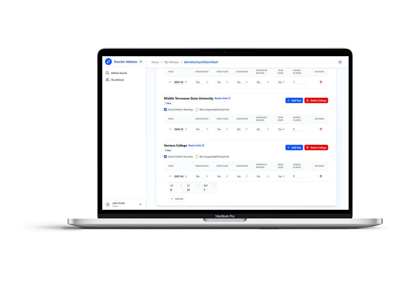 Access official stats from NCAA, JUCO, and NAIA athletes, including games played, scoring, and positional metrics.