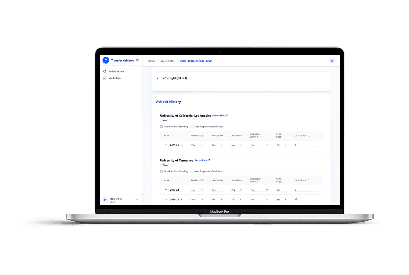 Stop manually researching every name in the portal. With Transfer Athletes, you can instantly research athletes on your own to see eligibility status, playing history, academic details, and recruiting information all in one searchable profile.